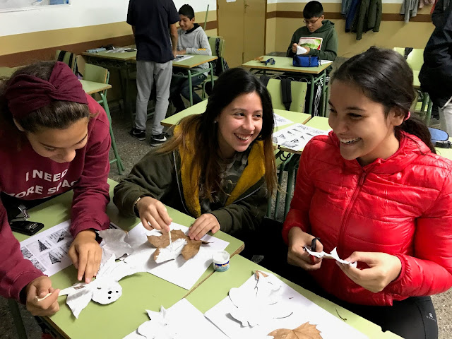 Ghosts made from balloons and leaves, spider webs made from polythene bags, bats and spiders that are the result of nice origami work, paper pumpkins on the windows... ! This is what our students were able to come up with, to prepare for one of the Celtic / Anglo-Saxon traditions they like best: HALLOWEEN. Our English lessons were transformed into Art lessons and we decorated our classrooms for the occasion. Some of the students even dressed up!
